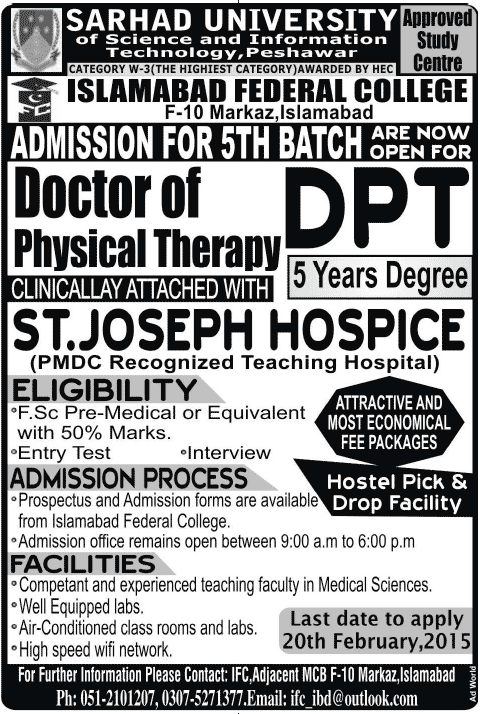 Sarhad University of Science & Information Technology (SUIT) Islamabad, Islamabad Federal College F-10 Markaz Islamabad Admission Notice 2015 for Doctor of Physical Therapy (DPT) clinically attached with St. Joseph’s Hospice