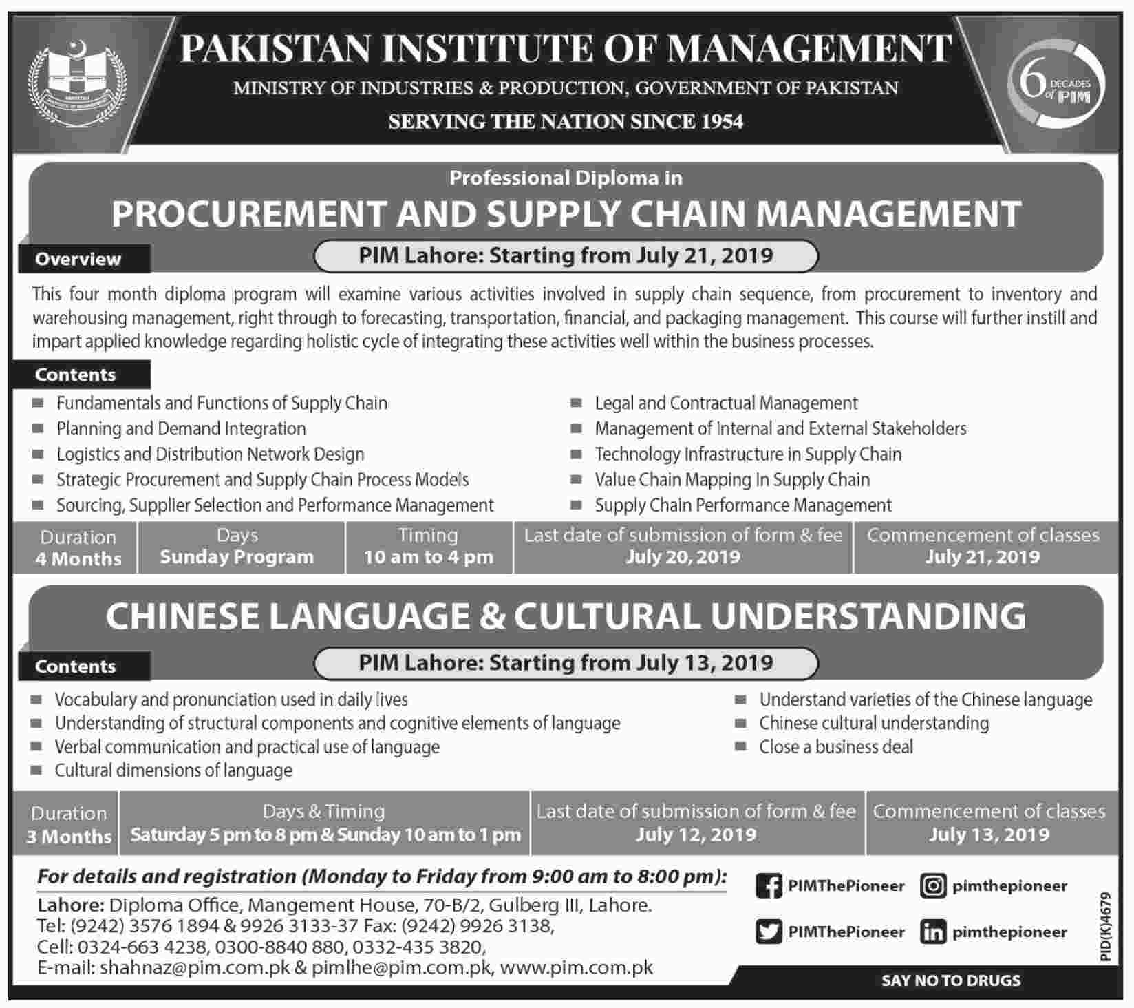 Pakistan Institute of Management Lahore Diploma Admission 2019 June 18, 2019 By Rana Waqar Leave a Comment Pakistan Institute of Management Lahore Diploma Admission 2019 Admission in Pakistan Institute of Management Lahore 17 Jun 2019