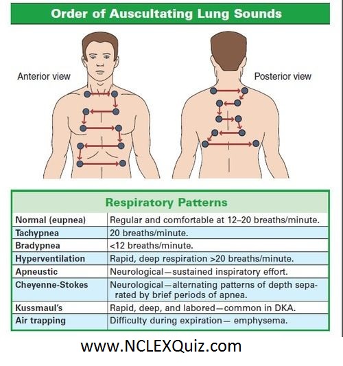 Lung Sounds and Respiratory Patterns March 23, 2016 By Aamir Khan Leave a Comment Order of Auscultating Lung Sounds and Respiratory Patterns