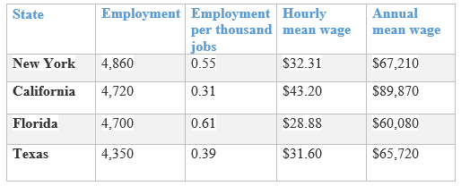 According to U.S. Bureau of Labor Statistics employment level, hourly mean wage and annual mean wage in these states are as: